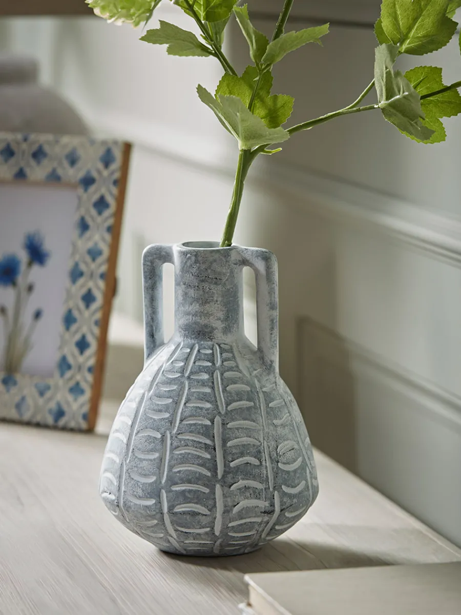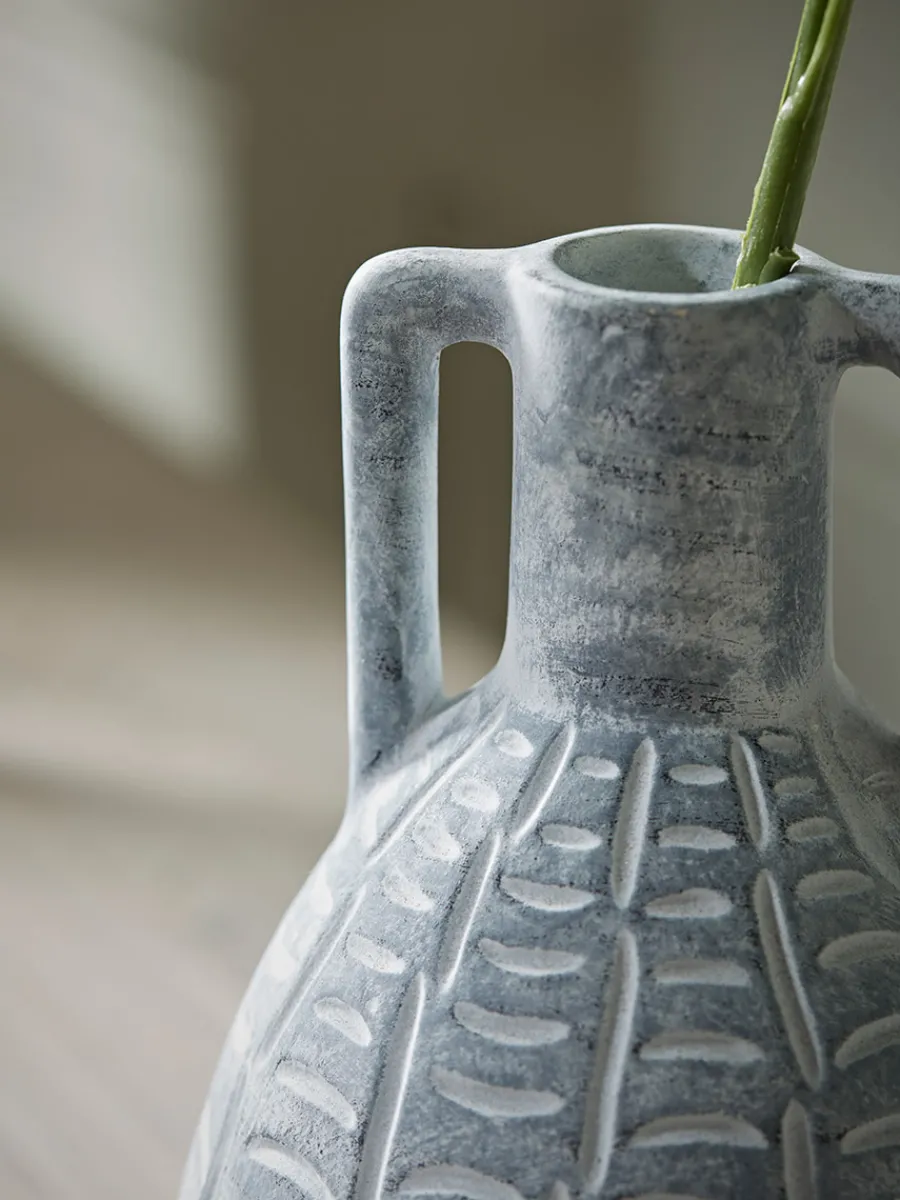 With an abstract engraved pattern, the ceramic has a soft aged effect, working to create a vase that has a sculptural quality to it.