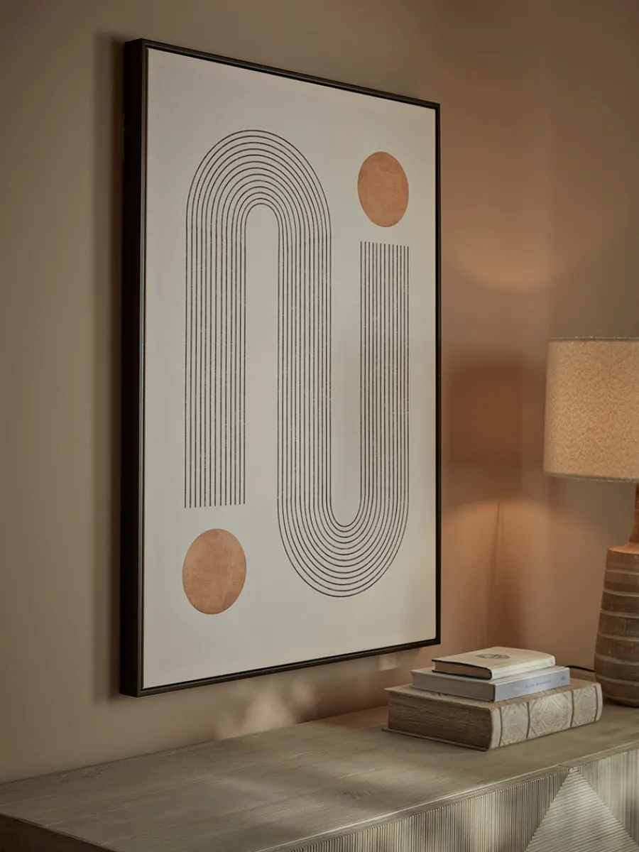 Its neutral palette with a pop of colour, from the two warm toned circles, situates it perfectly within our New Neutral collection for a minimalist and timeless design.