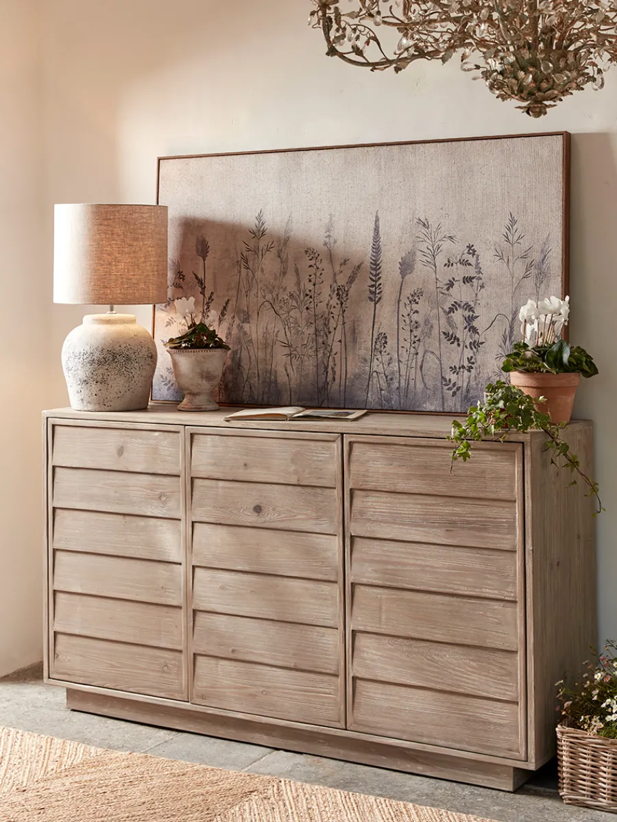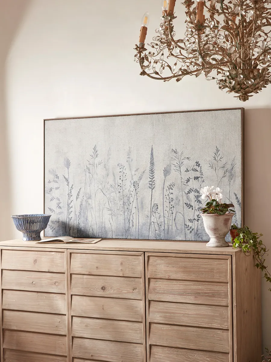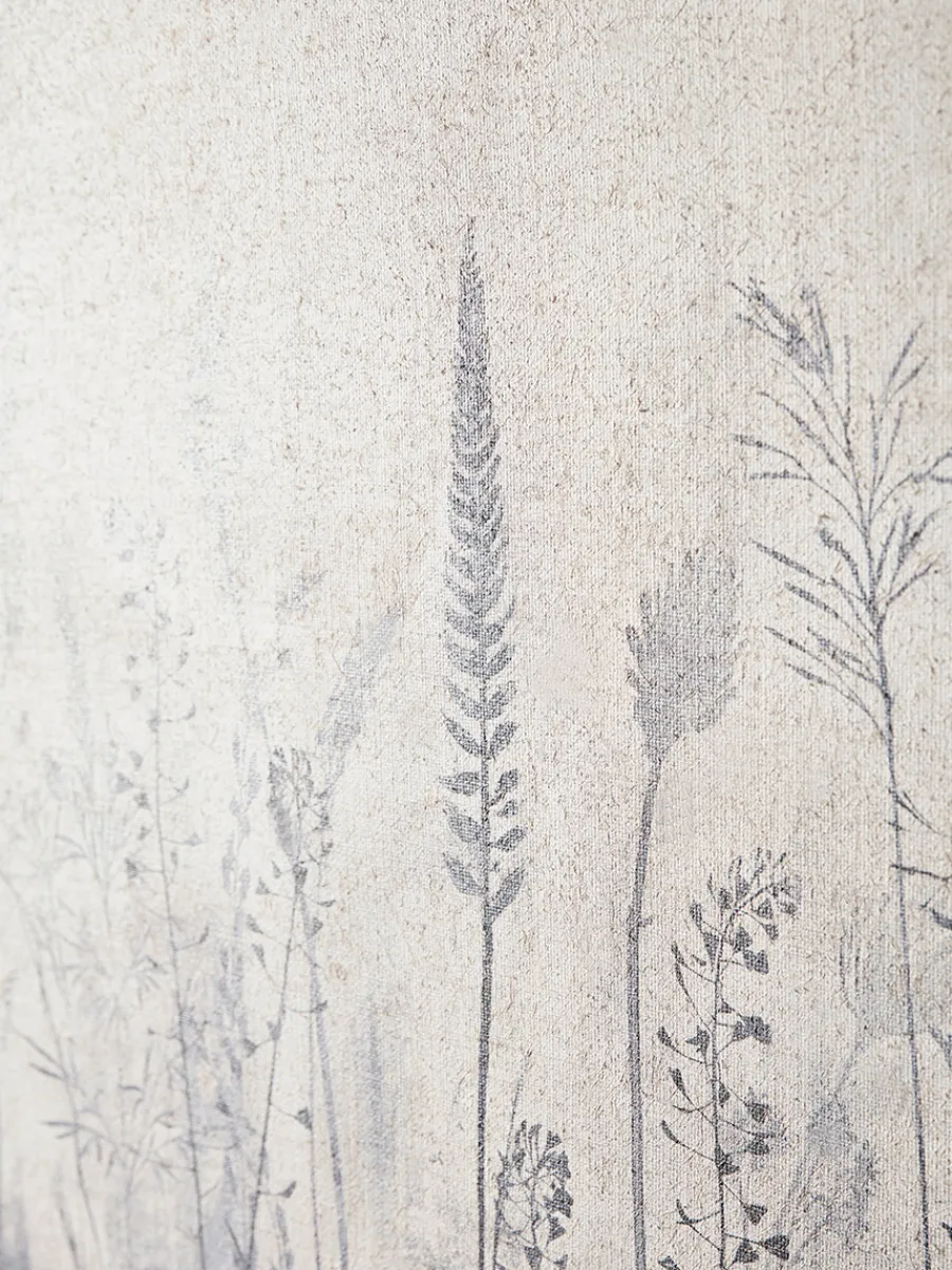 On a neutral background, the flowers bloom upward from the base of the frame and are printed in a somewhat moody dark blue grey, creating contrast whilst adding natural, rustic charm to your home.