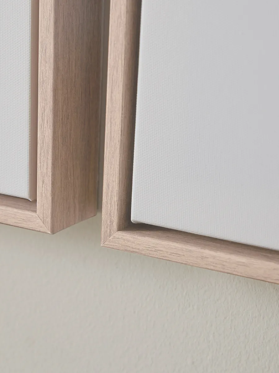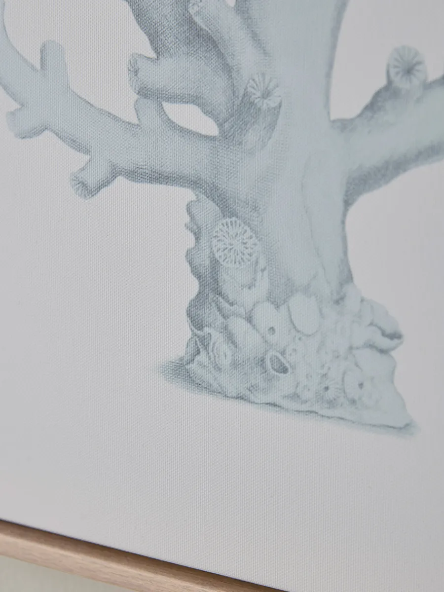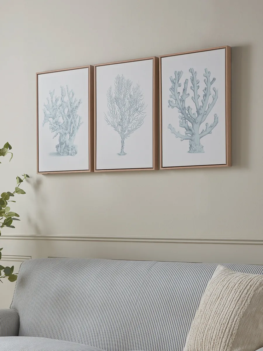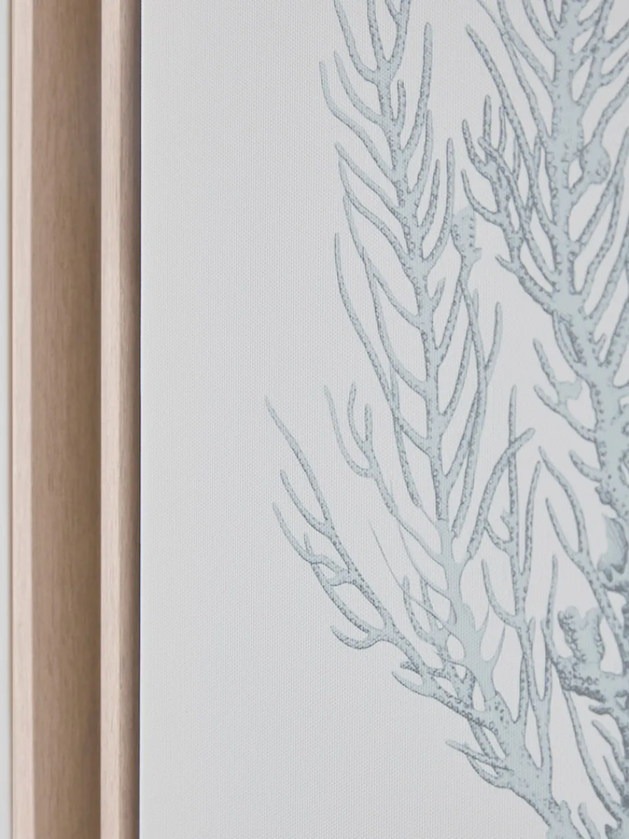 Set in floating wooden frames for a more polished contemporary look, this set of canvases features three different depictions of sea coral in muted, washy green tones.