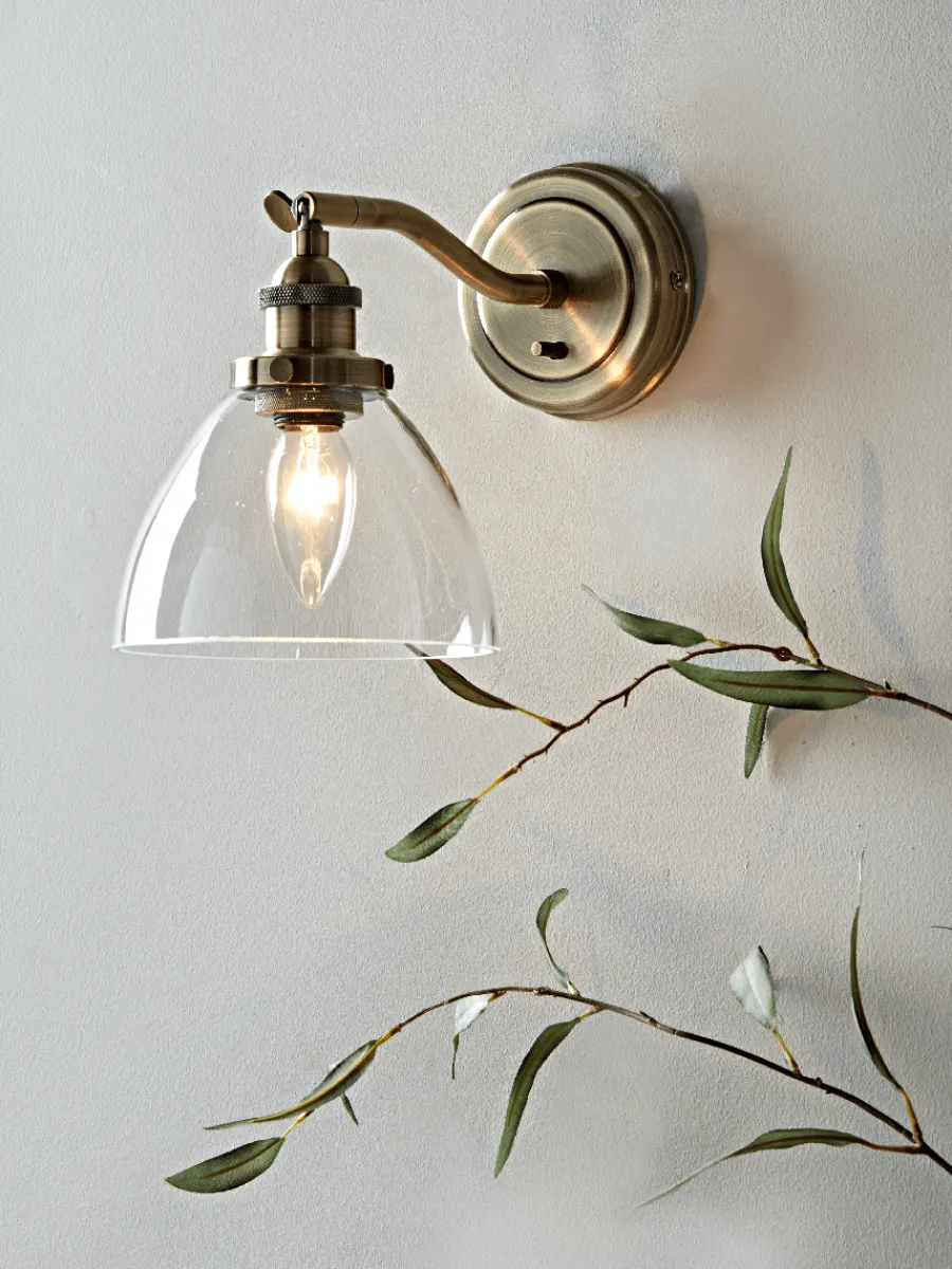 Carefully handblown glass, our contemporary domed shape wall light features a beautiful aged brass neck and matching round fixing.