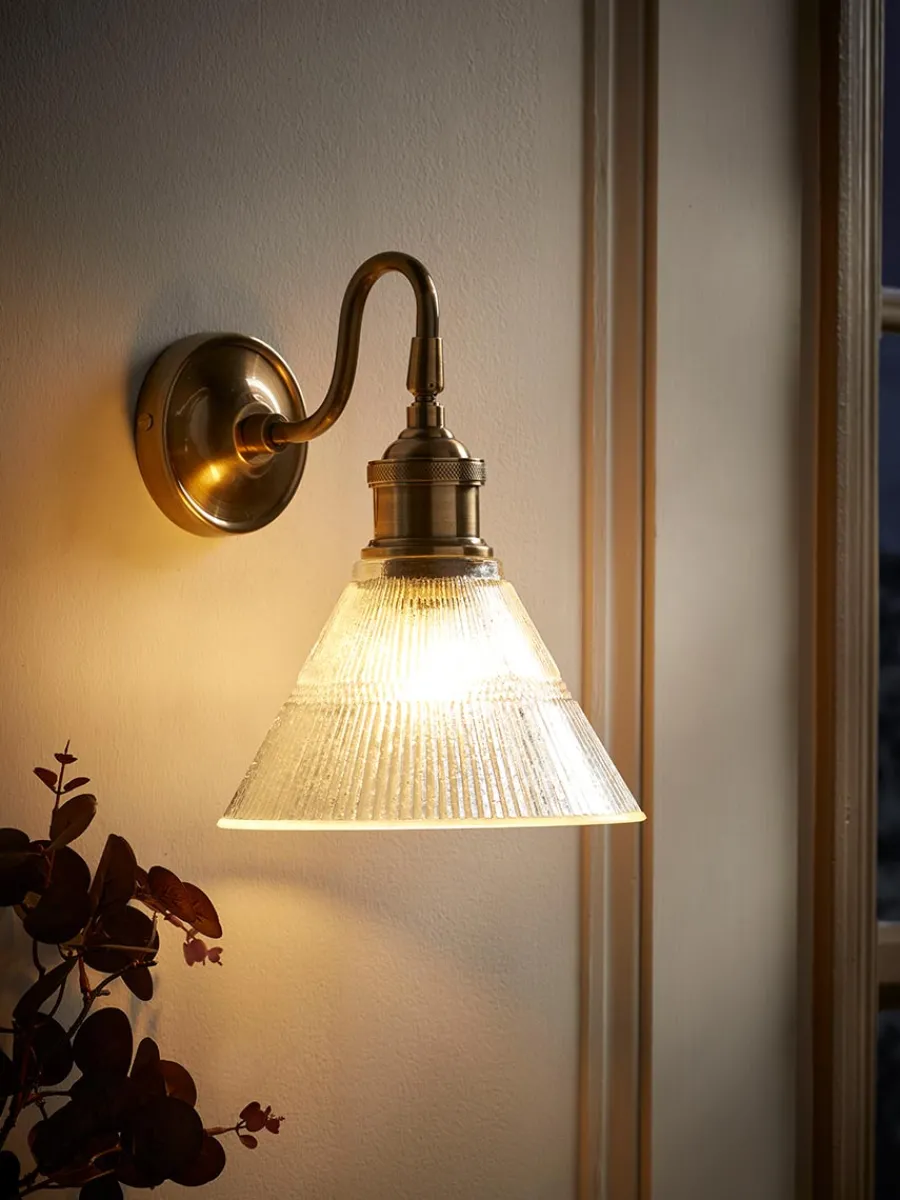 A tapered glass shade with a fluted design is held by a curvaceous bronze-toned arm with a round wall plate, creating vintage appeal that inspires simplicity.