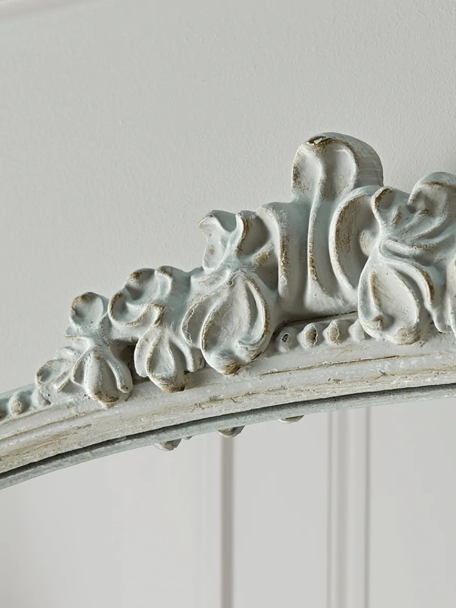The Rococo inspired styling of our wooden framed Glenside Mirror with its acanthus leaf decoration will bring a romantic faded elegance to any home. With a gently aged painted finish, this classic over mantle mirror will look equally stylish contrasting with a modern console or placed above a chest of drawers in a pretty bedroom.
