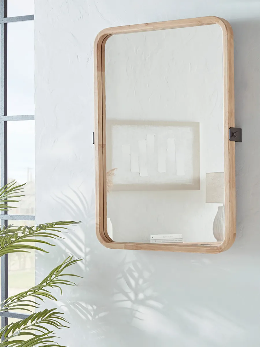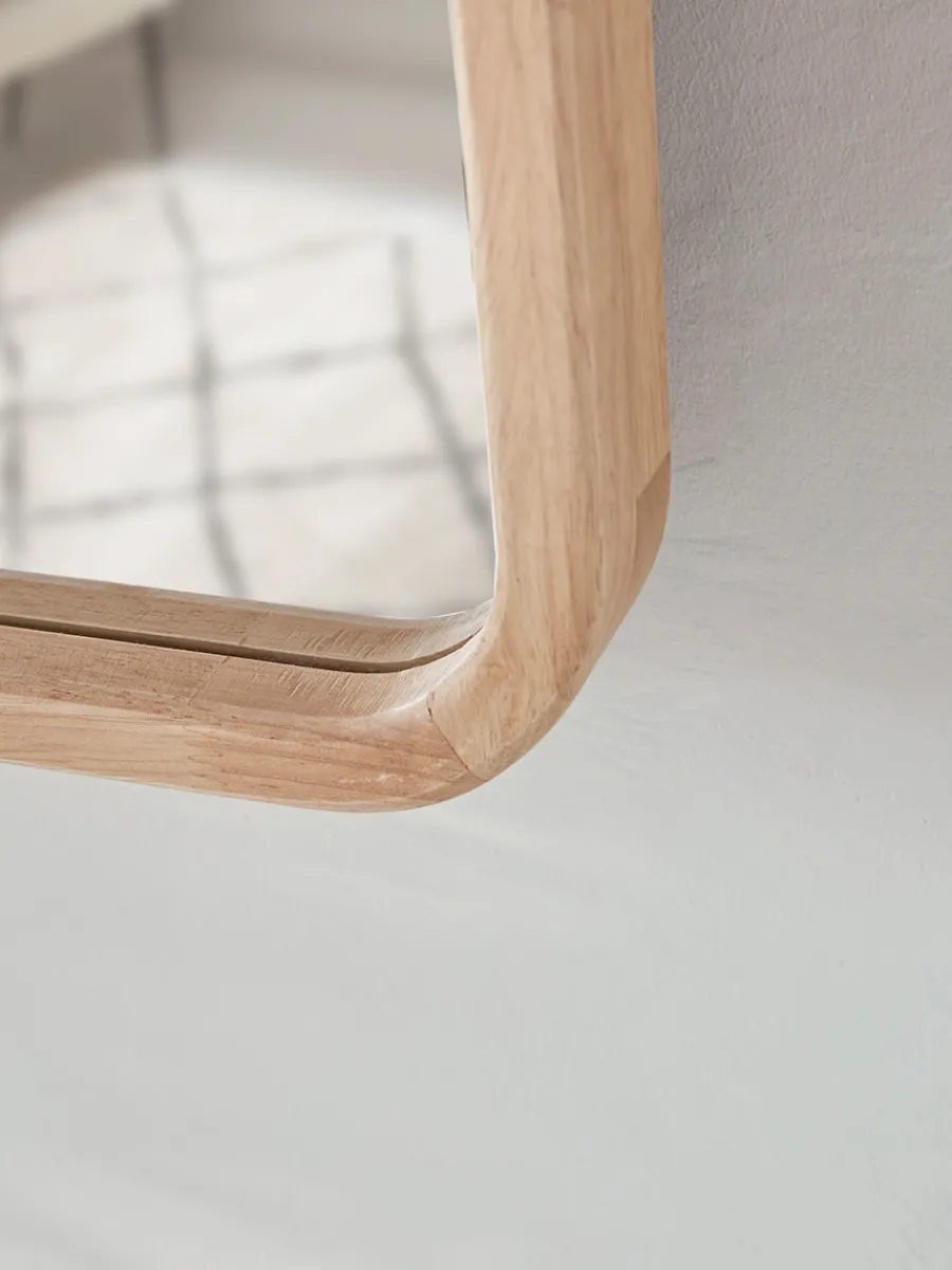 A simple wall mirror with a smooth rounded rubber wood frame which softens the outline, making it a wonderful piece for a hallway or bathroom. Matte black metal brackets offer a distinctive industrial finish.